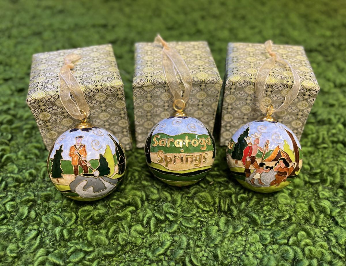 Our annual limited edition cloisonne ornament was inspired by the city seal this year. Featuring a Native American family taking the waters at High Rock Spring. This rare and one of a kind handcrafted work of art – Exclusively designed and curated by Kitty Keller- is an Heirloom keepsake ornament that can be enjoyed for years to come. Our Limited Edition handcrafted cloisonné ornament made exclusively by Impressions of Saratoga was made to celebrate our rich history tied to its naturally carbonated mineral springs. These springs, formed by a geological fault line, have been a draw since before European settlement, with Native Americans recognizing their healing properties. The area became a popular 19th-century resort destination known as the “Queen of Spas,” with visitors seeking to “take the cure”. Today, visitors can still experience the waters, either by bathing in them or enjoying the bottled Saratoga Spring Water. This beautiful ornament comes in its own box for storage. Inspired by the city seal there is a Native American family taking the waters at High Rock Spring. Plus a Dipper Boy, who used to bring the waters out of the springs to the visitors.