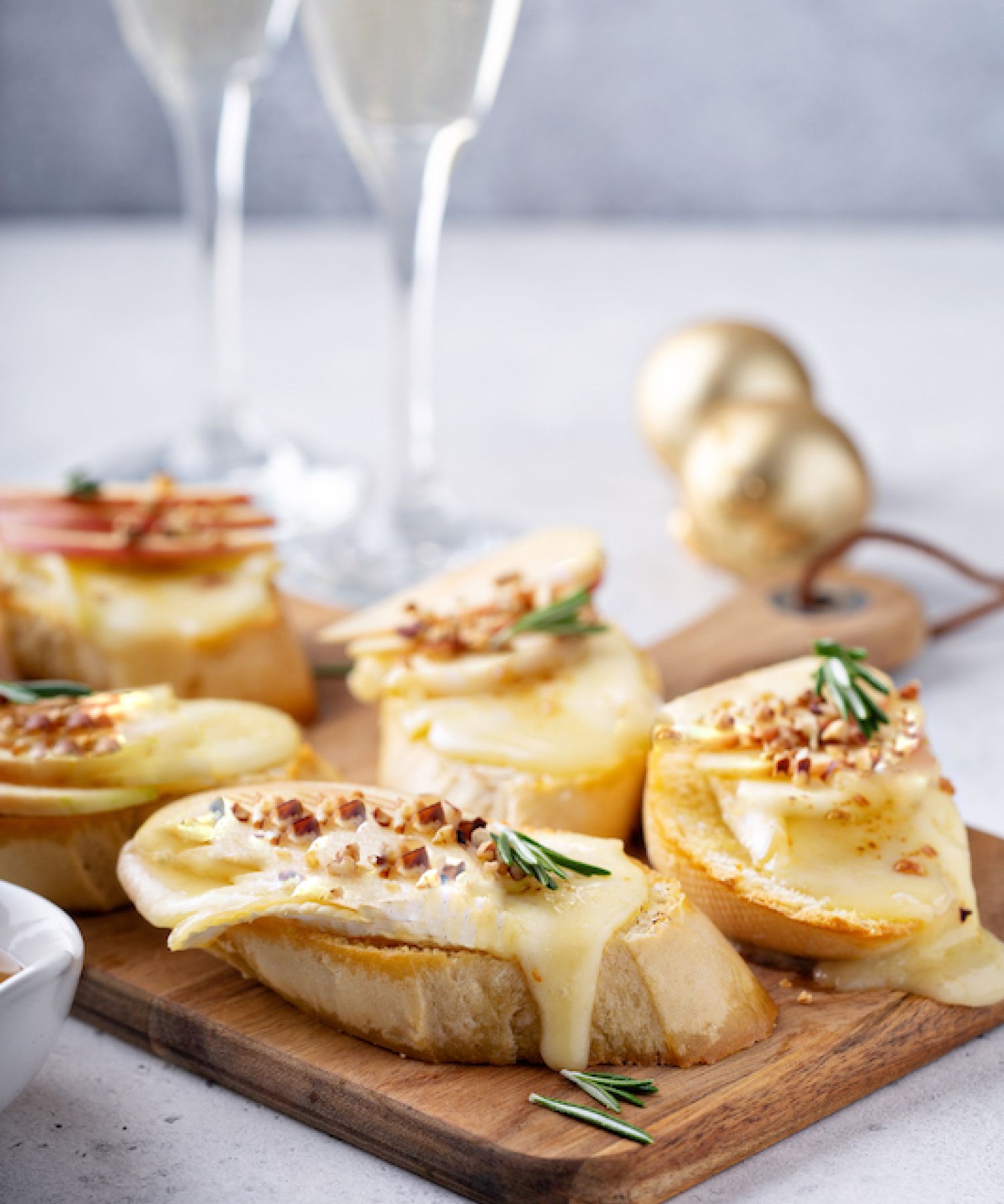 To assemble, spread the cheese mixture on each baguette slice, drizzle each with honey and sprinkle with the toasted walnuts. Refrigerate until about 15 minutes before serving.