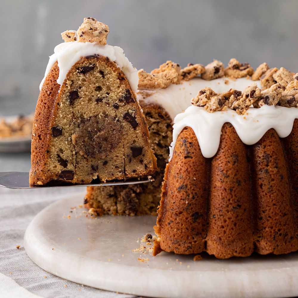 2. Spoon “Cookie Dough” Filling into trench, smoothing into an even layer; cover with reserved top layer, trimming pieces to fit and using extra cake pieces to patch any holes, if necessary. Place a serving plate on cake and turn so cake is right side up.