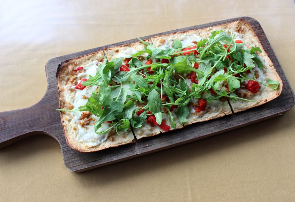 For instance, their flatbread appetizer changes daily. Ours was made with fresh-ground sausage, roasted red peppers, fresh mozzarella cheese, arugula, and a savory white bean spread. Served on a long wooden board, piping-hot, with the sausage still sizzling. The piquant flavor of arugula is so fresh you’ll taste the ‘nuttiness’ of its leaves.