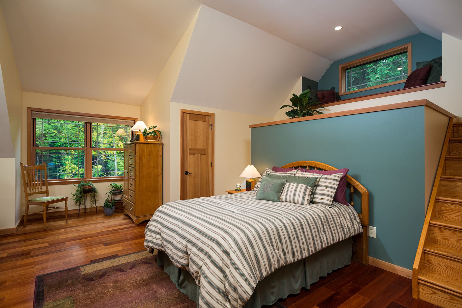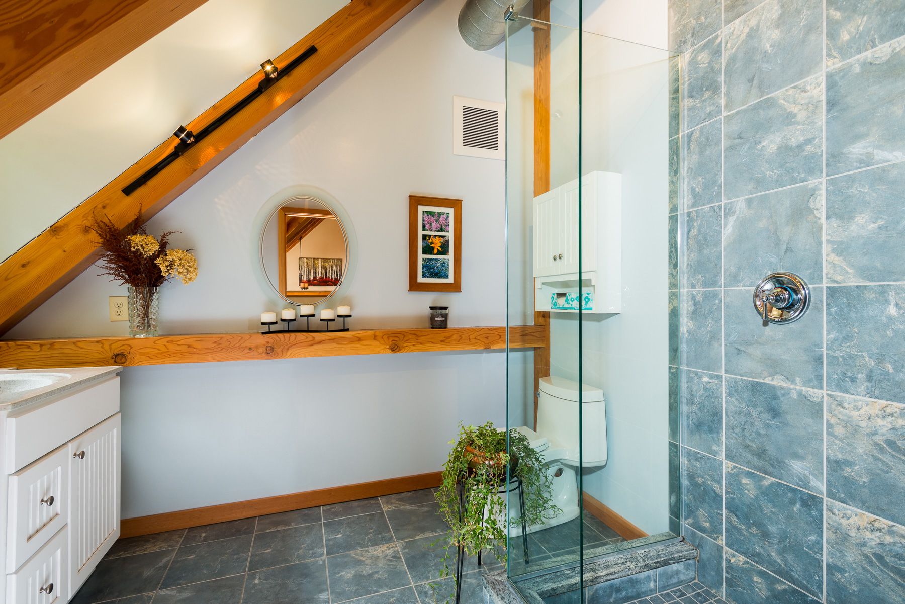 Upstairs yields 2 more bedrooms on either side of the spacious loft area and another full bath with glass enclosed tile shower.
