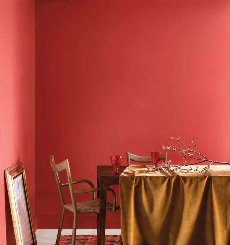 Raspberry Blush 2008-30 is a warm color and described as “saturated” by Benjamin Moore, meaning, the color is vivid and intense rather then muted like many of the colors we have experienced in past 10-12 years. It’s mix of Red-orange (red being the dominating color and therefore mentioned first) sets a room with vibrance and spontaneity. While the red draws you into the space with its allure of mystery, the orange undertones soften the environment making it welcoming and soothing. In this living space, Raspberry Blush is paired with Etiquette AF-50, the warmer “white” of the 2023 collection. Ah ha! You did see it! Yes…both of these colors work so well as they are both WARM! The eye responds to this “like” combination and senses the ease of the pairing. I personally love how the Etiquette simplifies the Raspberry Blush without diminishing its character!