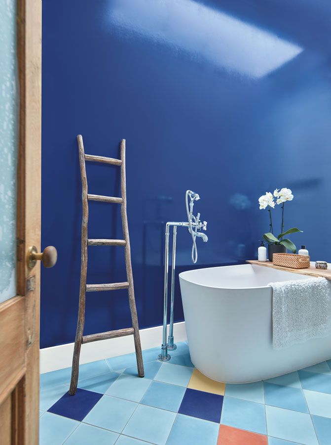 The color embodies a sky that beckons us into evening, but before we go, this luminescent blue strikes a chord just as the sun is setting into the horizon. Applied in high gloss, this color adds drama to this bath, offset by White Heron OC-57 and minimal elements of textural wood. Creating a mostly monochromatic atmosphere embodies the experience of bathing in and throughout water…I can feel myself floating, can you?