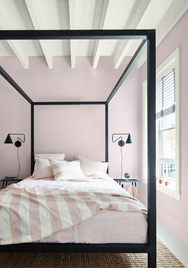 New Age 1444 is yet another color of low saturation but high lightness. Its light tint of pink is dreamy, fluffy like cotton candy without all the sugar to distract you from its beauty. Here, it’s paired with black and white accents, adding a softness to the modern farmhouse look we have adored now for a decade. Even some of my younger clients have been wooed by this hue and have found delight in adding color to their otherwise all white accommodations in fear of missing the mark. Jump right in, I say…it’s like landing on a soft pillow of comfort, a haven that won’t disappoint.