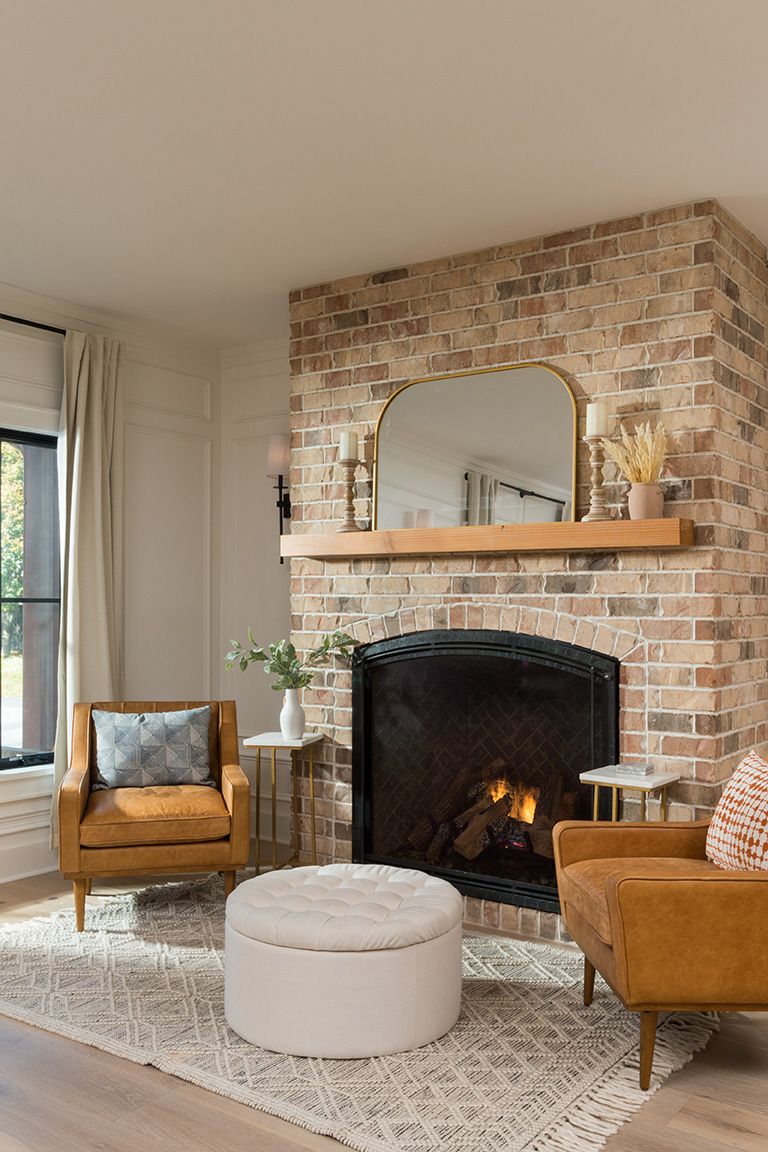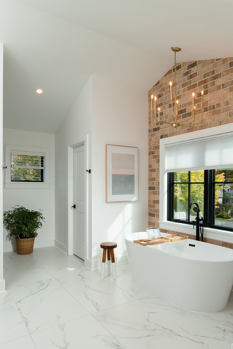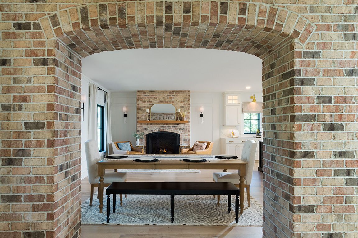 The exterior displays architectural elegance with timber frame gable accents and a foundation of antique tumbled brick (sourced from North Carolina) at the base of the home.