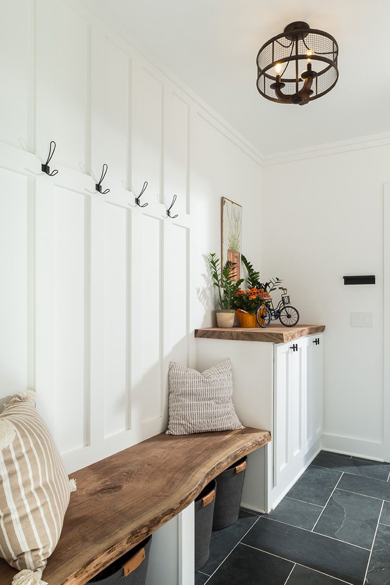 Often overlooked but essential for busy households, the mudroom is a handy catch-all entry, corral clutters, and features black walnut surfaces. This beautiful wood, salvaged on-site from a single tree, is also used upstairs in the stylish tiled laundry room.