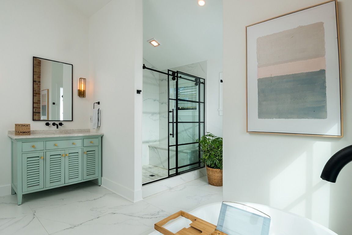 In addition to the relaxing tub, the sumptuous bathroom features dual vanities, water closet, and spacious shower with sliding barn glass door.