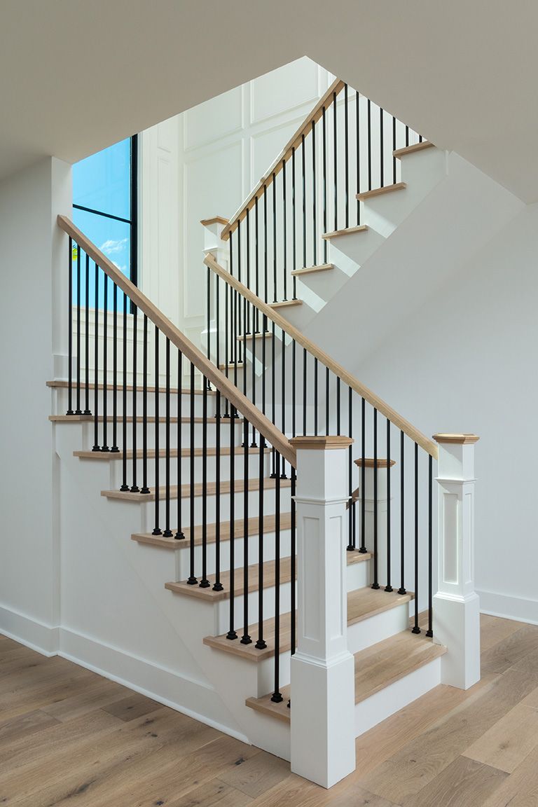 The calm tranquility of the upper level is hinted at starting in the stairwell, where molding adds depth and an old-world charm to the walls.