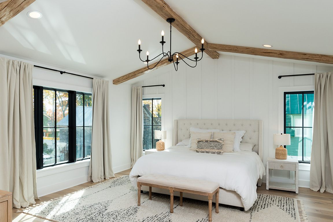 A welcome retreat is established with open ceilings and exposed rafters in the master bedroom.