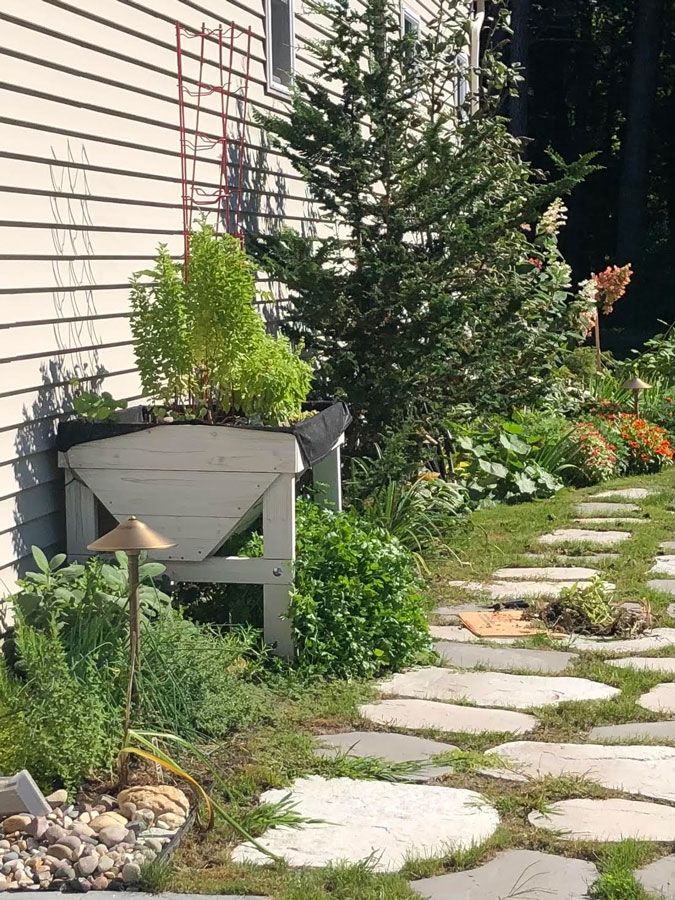 The Meaghers started with a blank canvas and acres of sand, and now have perennials, flowering shrubs, herbs and vegetable, hostas from their prior home, peonies that were Ed’s mother’s in Eagle Bridge, and hollyhocks inspired by the couple’s recent trip to Denmark.