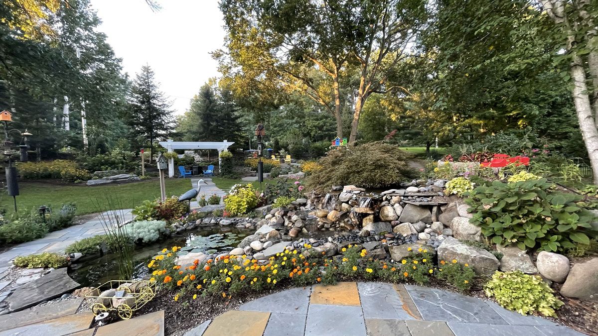 In phases over the past quarter-century, the vast lawn has given way to multiple mulch beds, colorful circular sitting areas with Adirondack chairs, stone and grassy paths, unique “Adirondack walls,” flowing water and a variety of flowers and other plants.