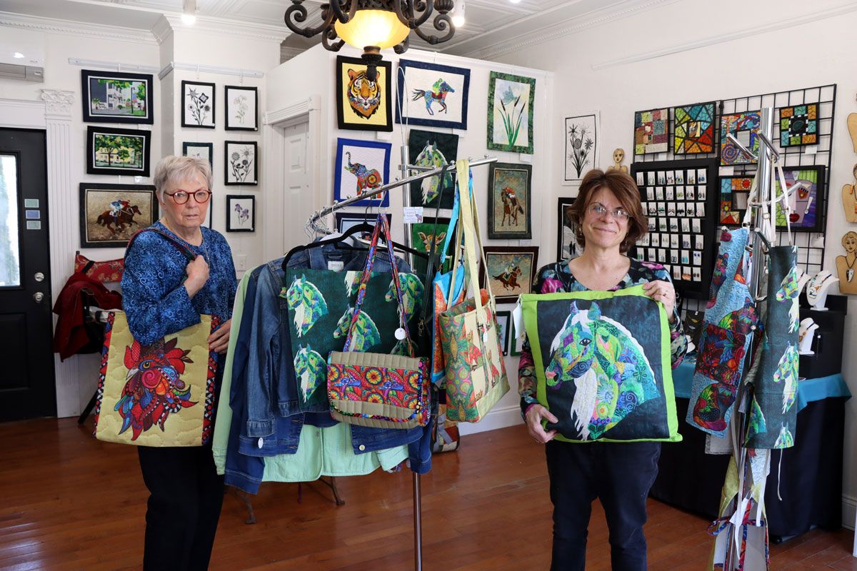 Meg and Susan met during “pop-ups on Beekman Street, and as fellow quilters, they were impressed with each other’s skills and subject matter choices. Their techniques differ, yet they share a strong passion for fiber art. And it shows.