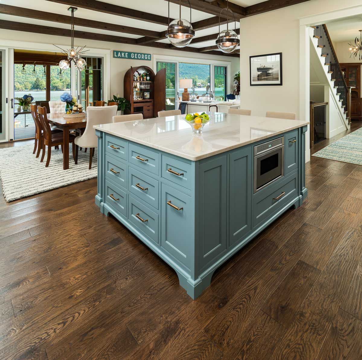 Some of the challenges facing the original structure were aging electrical, cramped spaces, and mostly, the view was more of the boat house than the lake itself. It was time to start over. The house was torn down and a new set of plans were crafted by Dean Howland and built by his son, Jake, of Howland Construction. With the project starting from scratch, the Haraden’s knew they wanted help with the interior and exterior selections…they wanted to get everything right…that’s when I was invited to become part of their dream lake home endeavor.