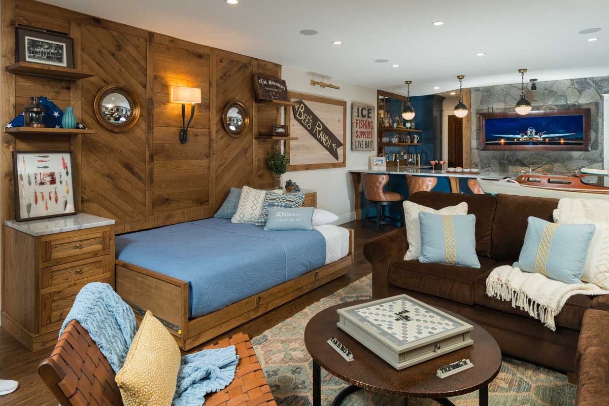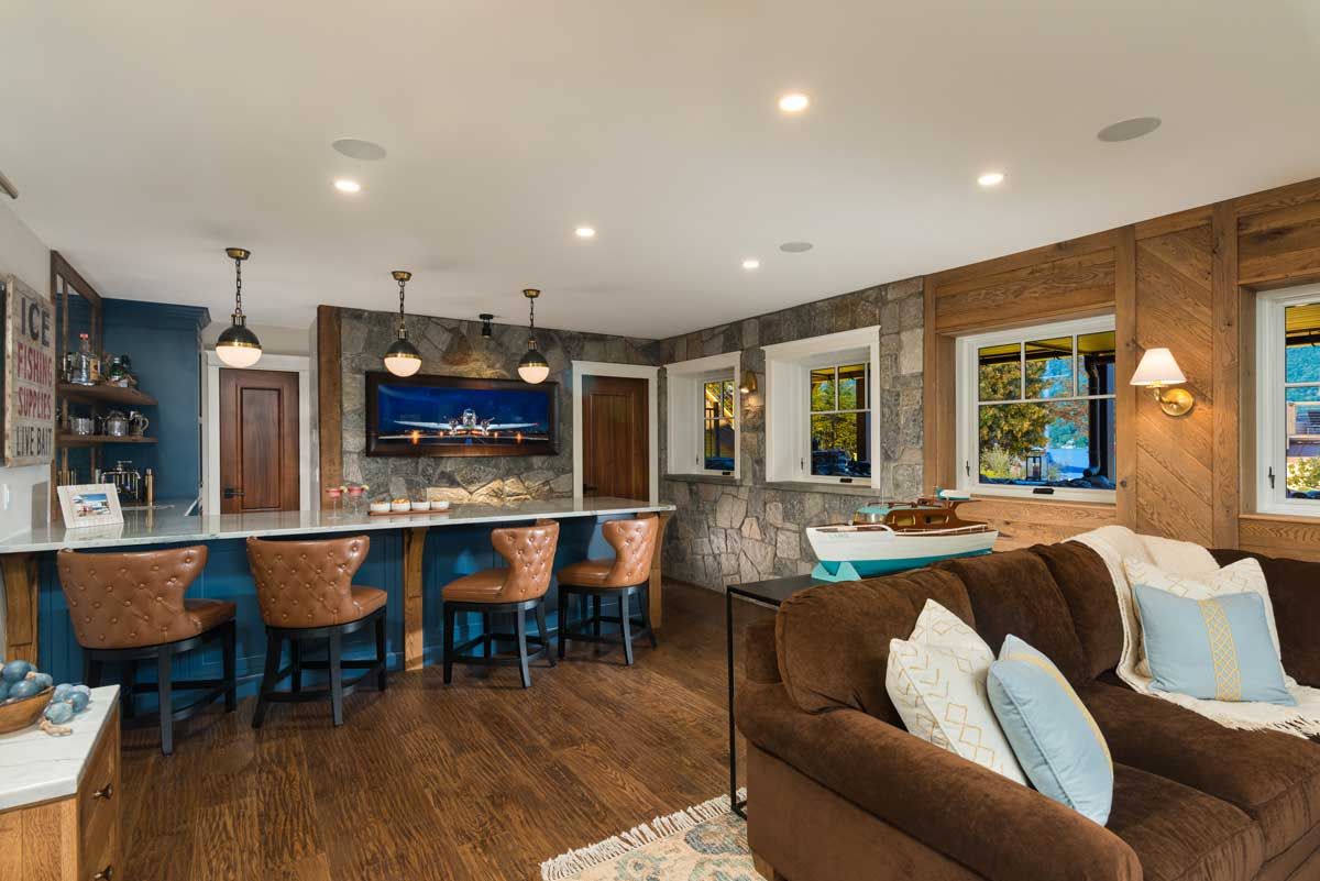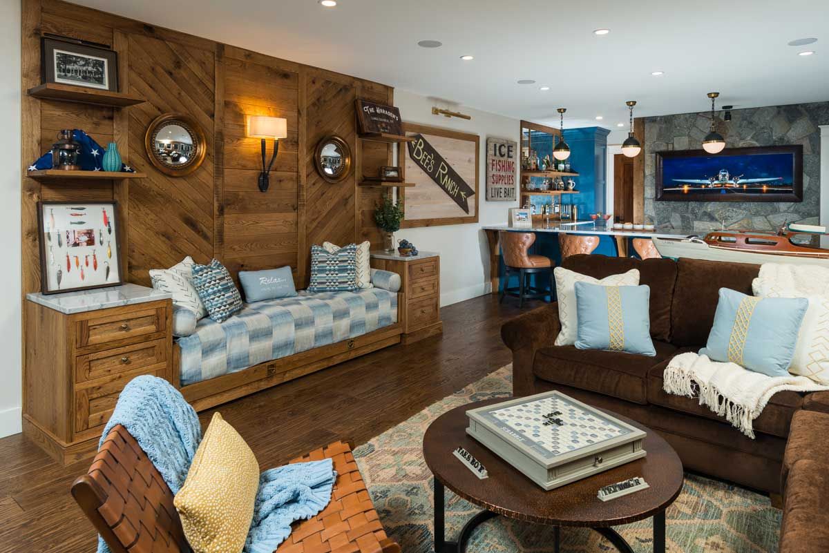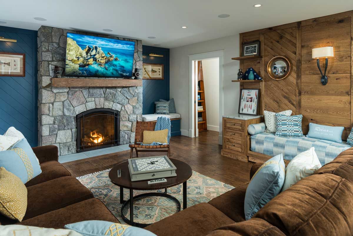 When I first reviewed the plans for this level, I noted a row of 4 large windows that needed to be broken up to better designate each area. I discussed the idea with the Haradens to use the same stone we selected for the exterior foundation and bring it inside to suggest that possibly they retained the original basement and built up. From there, the sitting area would be defined by angular planks on the wall, divided into sections to create an architectural feature. This singular large space in the lower level now found intimacy without disrupting the open feel they longed for. It also lent itself to incorporating a built-in “loveseat” with shelving, side tables and a little surprise…you see, that loveseat backs up to the staircase leading to the first floor. With the desire for additional sleeping quarters in the lower level, I designed a queen trundle bed that pulls out from beneath the staircase…and voila! In addition, the cozy built-in bench just to one side of the fireplace houses all the bedding needed as well!
