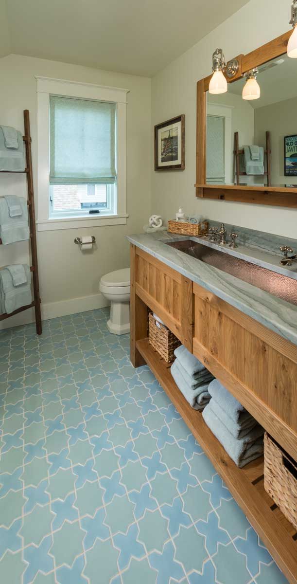 Atop the main staircase resides the hall bathroom shared with a guest bedroom via a walk-through shower area. I was inspired by the dimensions of the room to craft an elongated trough vanity where grandkids would one day line up to brush their teeth together before heading off to bed. The dual waterfall faucets spoke to the feel of summer splashing fun while the hammered polished nickel sink nestled itself within the white oak cabinetry below, echoing the timeless notes of the Adirondack woods. The cross and star hand crafted tile glazed in crackled blue and green added a touch of playfulness over a more expected selection.