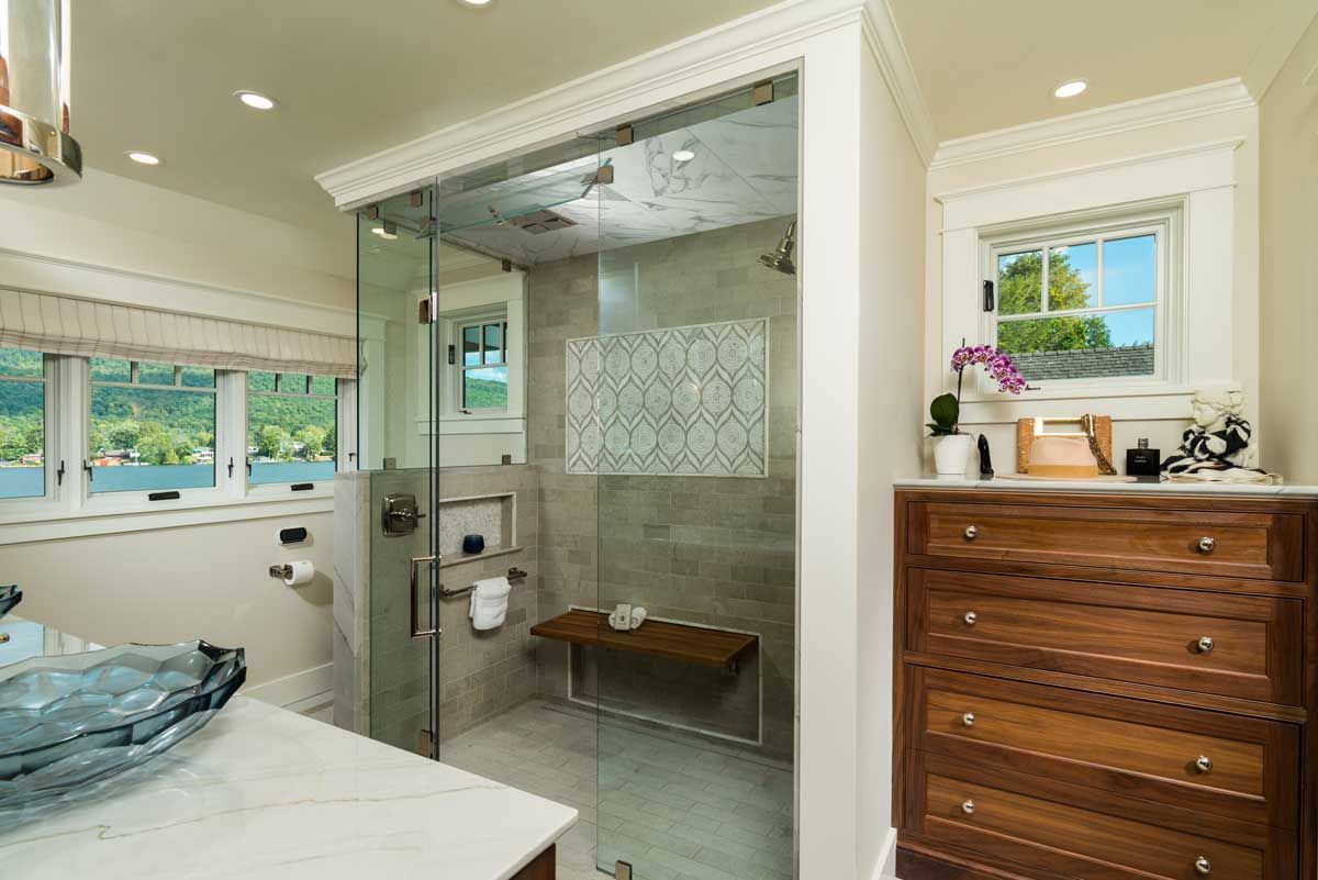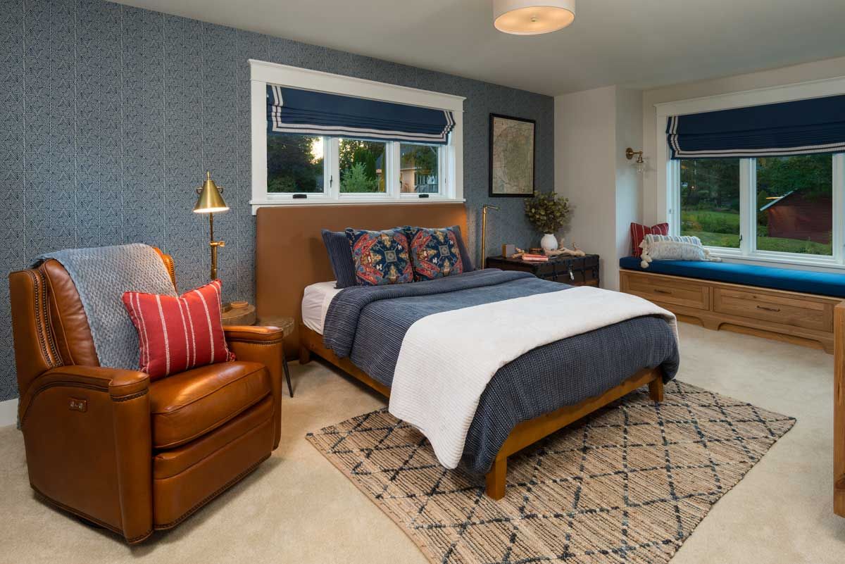 The guest bedrooms each had their own individual feel. The larger rear room is appointed with a private bath. The oak vanity detailed with book matched woodgrains sets the stage for the hand-crafted ship’s wheel with mirror above. To add the sense of water to this back room, ogee-dropped tiles both on the floor, and within the shower, were installed in varying layouts to create the feel of being on the water even though the view was a bit removed. The bedroom came together with the inspiration of highlighting the long wall with wallpaper. A custom headboard was upholstered in InsideOut faux leather for its durability, yet authentic in touch, to pair nicely with a leather recliner adjacent to the bed. Another long built-in bench offers a restful view of the lake while an antique Taylor trunk sits just below an original printed map of Lake George by New York Central Lines depicting the railways to the Adirondack Mountains.