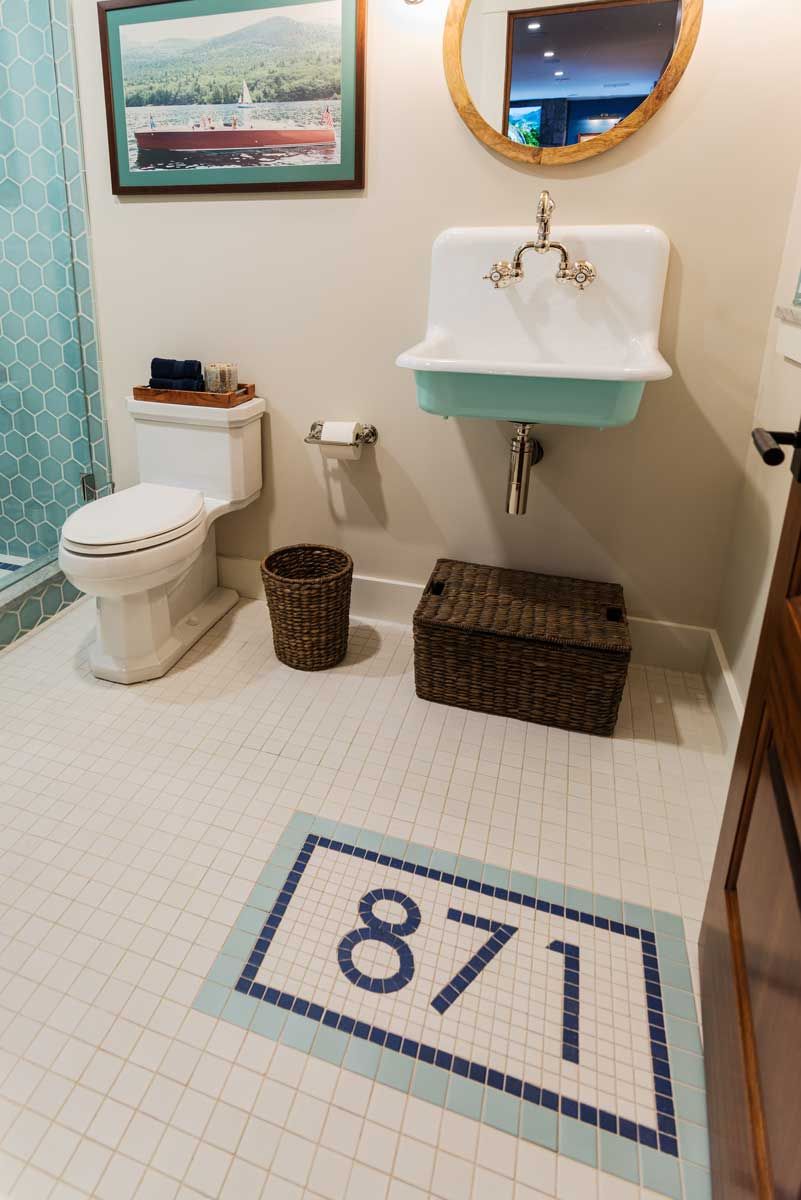 Just as this home will be passed to the next generations, in the same vein, it was important to remember who taught Steve to sail, enjoy family and continue the heritage of running the family business…his dad. The two loved sailing together, so as a memorial, I suggested commemorating his legacy by adding a tiled rug of his sail cloth number into the lower-level bath floor. When the next generation asks what the number means, it’s an opportunity for storytelling and memories to come alive!
