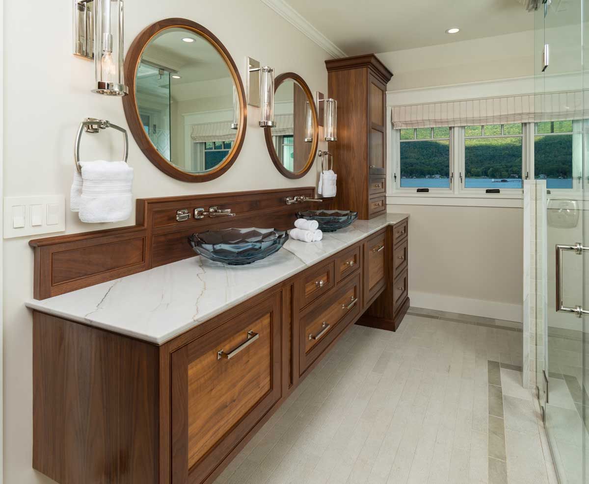 In the master suite, the private bathroom was detailed to reflect the needs of the masters of the house. With a long slender space to work with, I designed a hand crafted walnut floating vanity that stretched the length of the room, concluding with a tower for additional storage. The openness below expanded the sense of space. Hand crafted circular mirrors were carefully placed so both Dee and Steve could properly utilize the vanity without compromising symmetry. To add a nautical touch, the streamlined faucets were artfully mounted over glass carved bowls that brought the essence of water to a whole new level. For the shower, a steam option was desired, but the space was not large enough to add a full bench. Just our luck, the chimney enclosure for the fireplace below just so happens to reside on the outside wall, adjacent to the shower stall area. This provided just enough room to create a large niche where I could incorporate a lift-up teak bench for two when needed. With the use of authentic boat seat hinges, luxury was not sacrificed over size. But what about the steam generator? That had to be accessible…no worries. It’s well hidden within the lower bottom “drawers” of the dressing table just to the right of the shower stall. With a little tug, the generator is fully exposed for repairs.
