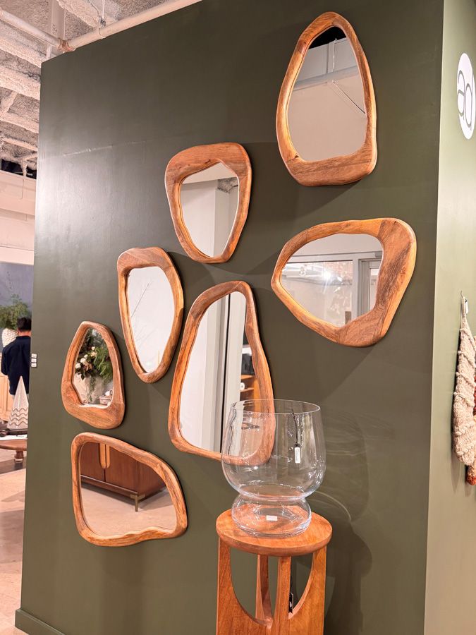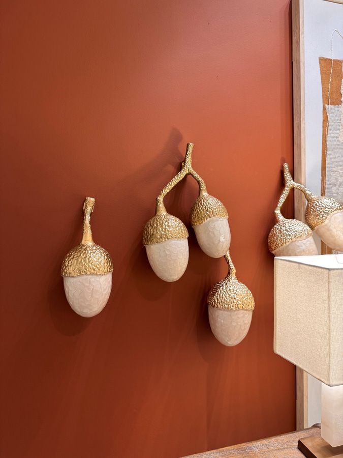 For accessories and décor, there seemed to be an air of playful, self-reflective statement pieces. Marble hand weights, larger-than-life gold screws and nails, zipper in an action sculpture and why not…a life-sized carved, wooden motorcycle as a statement piece in lieu of a baby grand! Fun, Fun, Fun!! Getting back to organics, the free form, unrestricted statement pieces continue to be plentiful! From vases to bowls, mirrors and enlarged acorn wall statements, each takes the restriction of life and lets it loose for just a little while!