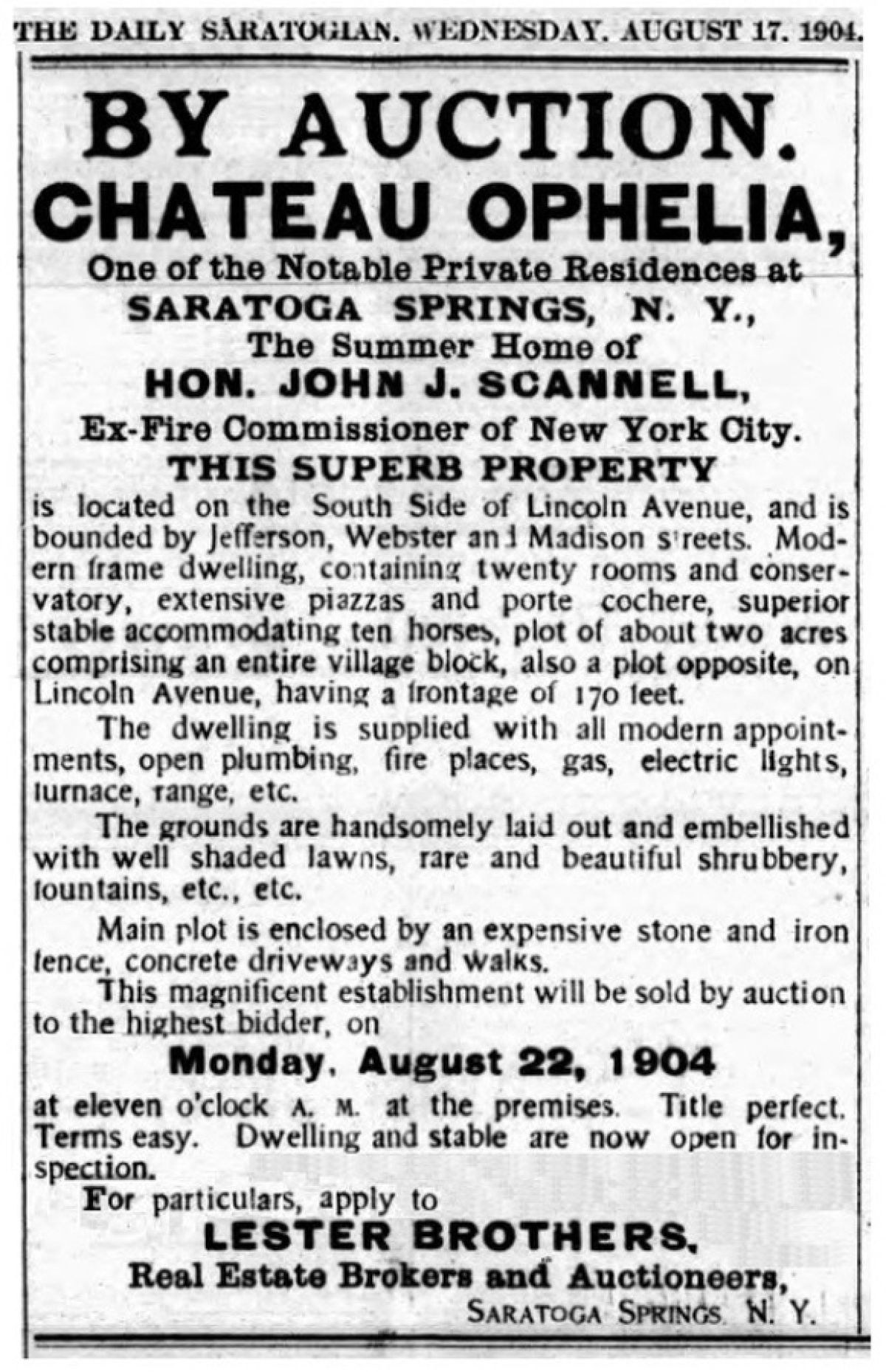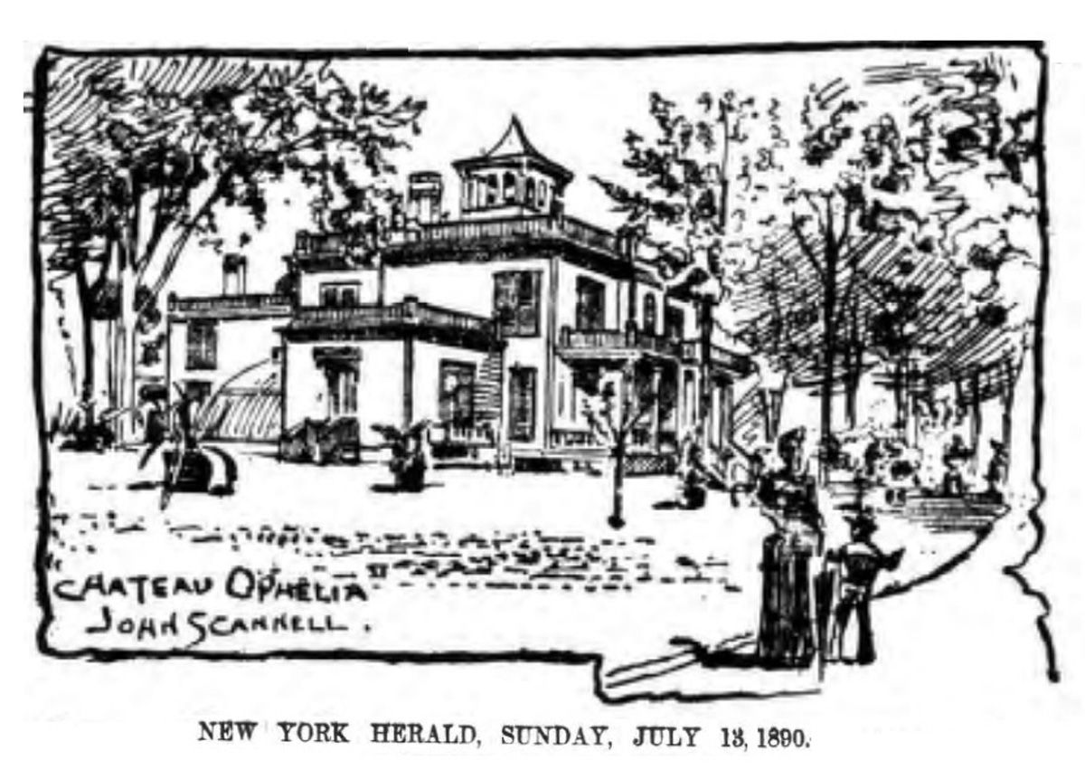 The Hillsburgh heirs eventually transferred the property, which became the possession of John Jay Scannell in the early summer of 1889. Mr. Scannell was a widower, his late wife Ophelia having passed away while only in her upper thirties, some six years prior to his Saratoga Springs acquisition. The new owner reached out for local professionals; architect R. Newton Brezee and landscape gardener Charles Ludwig, to improve the property he designated Chateau Ophelia into his vision of a summer place to be. J.J. Scannell made a fortune distilling whiskey and became a Tammany Fire Commissioner in New York City being well connected in the Democratic Party of that time. Early in his political career John Scannell killed a man, who had shot and killed his brother, and employed a temporary insanity plea. Like a number of men who visited Saratoga Springs in the late nineteenth century, such as John McBain Davidson who built his home at 203 Union Ave and was a partner of John Morrissey in founding the Race Track, Ed Kearney, Saratoga Association President, and William C. Whitney, Mr. Scannell also had deep ties to the Tammany Tiger of the then unincorporated metropolis. A frequent guest at Chateau Ophelia, which was improved into the style of a fine large French Villa, was Tammany Boss; Richard Croker. Mr. Scannell and Boss Croker both bought, sold and raced horses on an extensive scale, operating a large export trade shipping equine stock to Europe, making Chateau Ophelia their Saratoga base of operations.