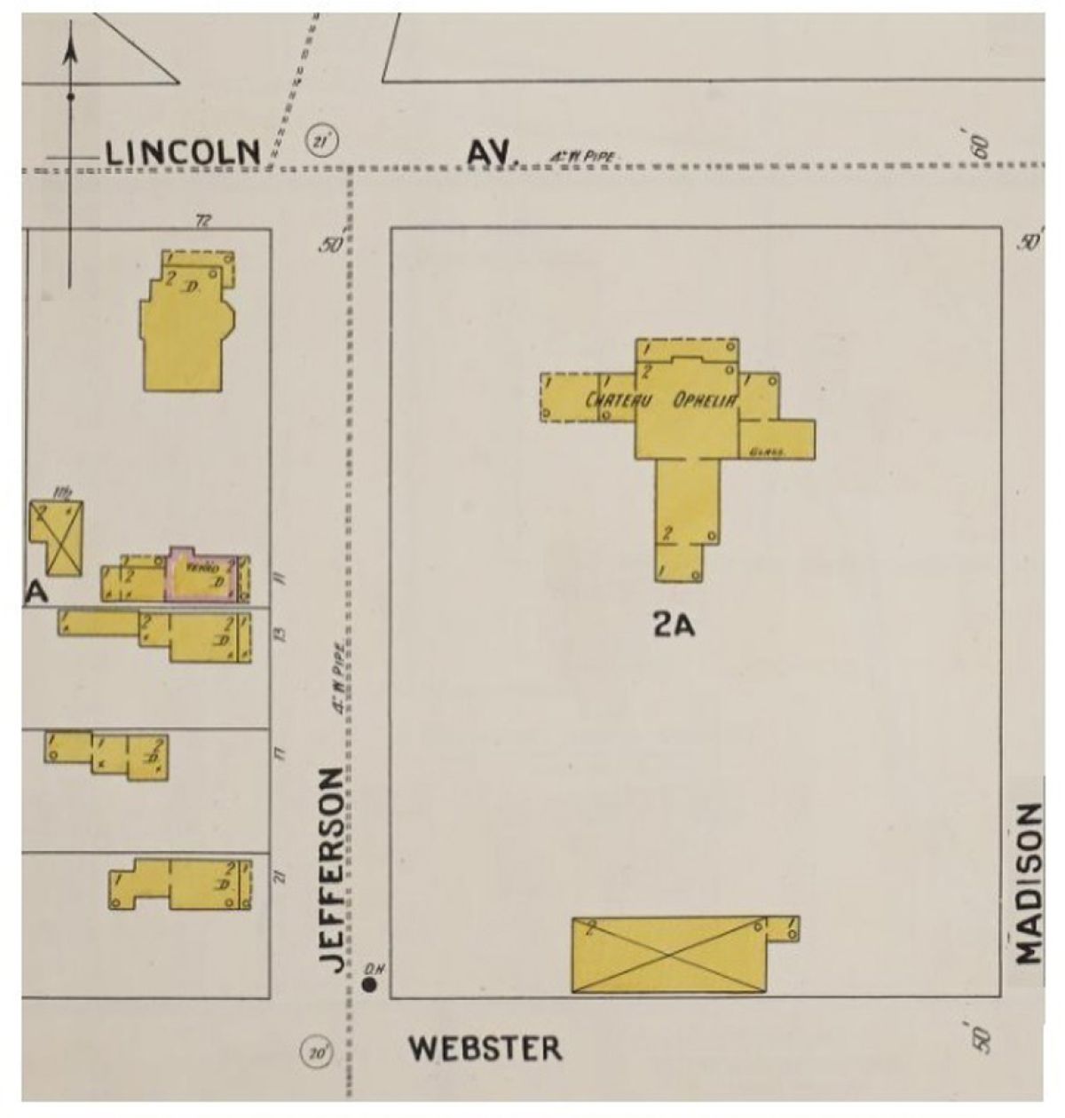 1900 Sanborn Fire Insurance Map depicts the location of Chateau Ophelia at the Five Points. Courtesy of Saratoga Springs Public Library – Saratoga Room.