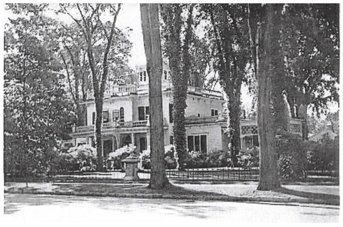 Chateau Ophelia as seen through its shading fountain elms from the Five Points. Constructed in the Italianate style, the mansion's exterior featured a low-pitched roof with cresting railing on both stories, projecting eaves supported by large decorative cornice brackets, tall windows with ornate pediments, and a square belvedere. Courtesy of Saratoga Springs Public Library – Saratoga Room.