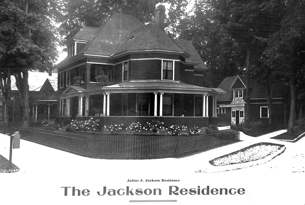In 1902, Julius Jackson, president of the Standard Wall Paper Company in Hudson Falls, hired Newton Brezee to build his paradise on this "conspicuous site, in a portion of the village noted for its beautiful residences" (Saratogian, 1902). The grand home, with its wraparound porch, red-shingled exterior, white trim, and bright green roof, became a local showpiece admired by passersby.