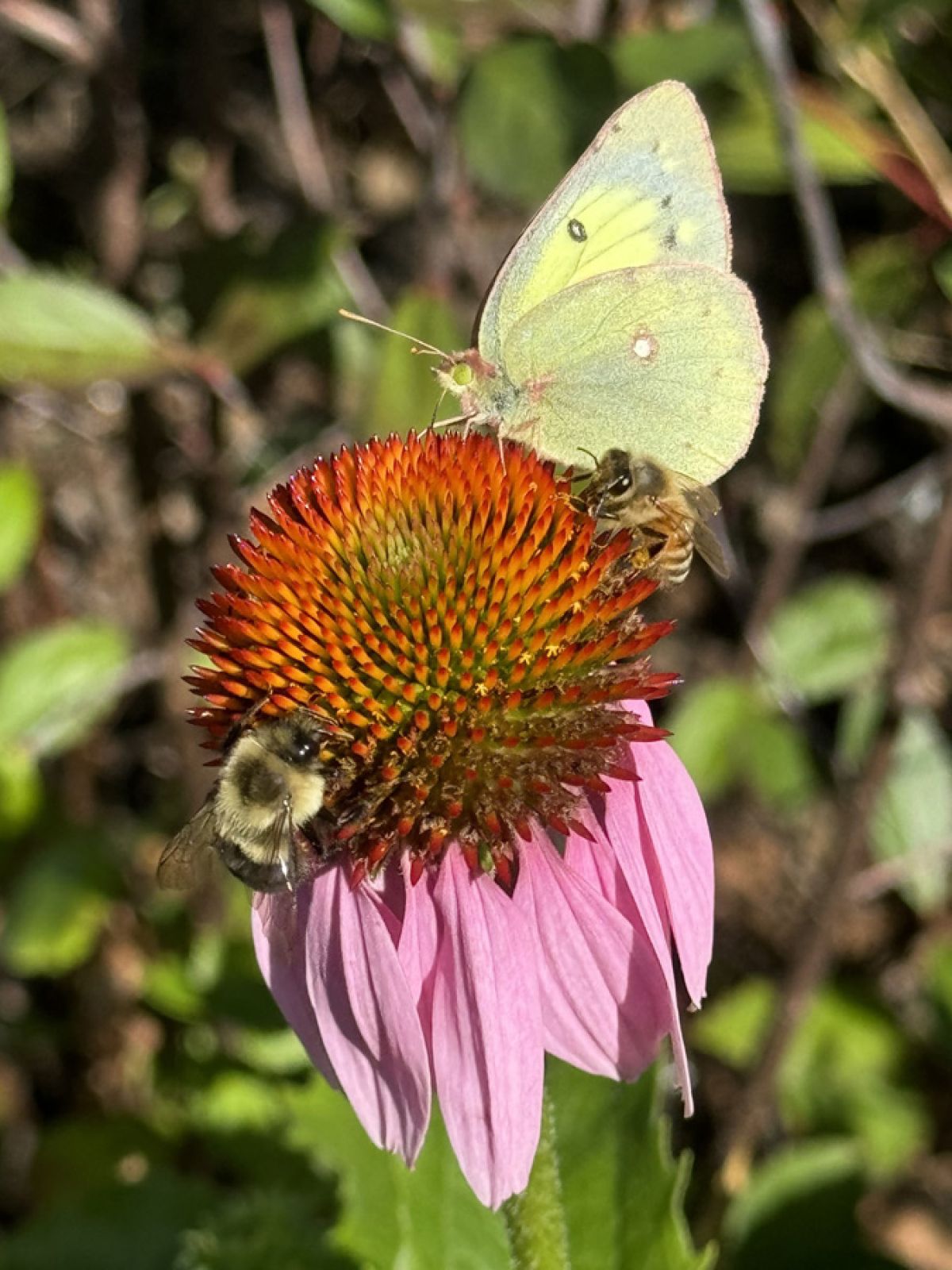 This past July, Coneflowers in 209 South Broadway’s ecological garden attracted pollinators such as this Common Eastern Bumblebee (Bombus impatiens), Honey Bee (Apis mellifera), and Clouded Sulphur butterfly. Photo by Johanna Garrison
