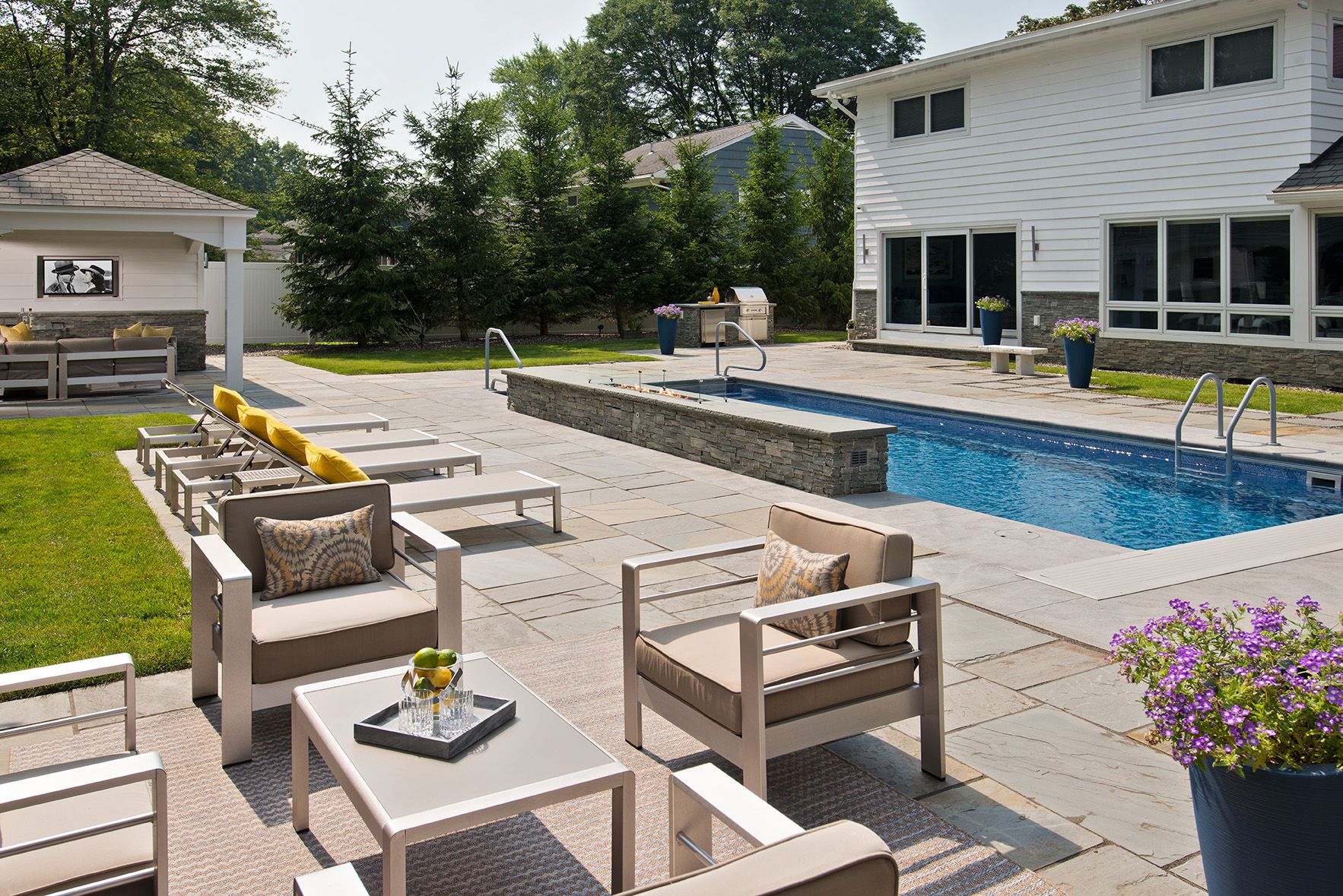 When you love four-season entertaining, making use of outdoor space is of vital importance. Because of the large wall of windows in the back of the house, the outdoor area has to be both beautiful and fun.