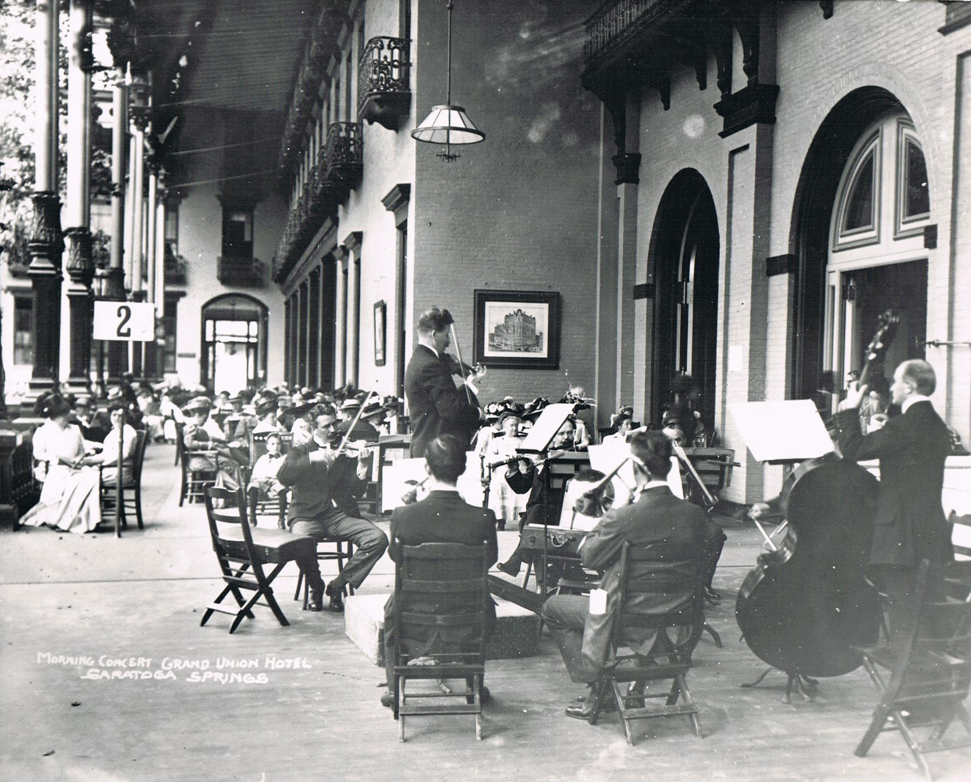 The grand hotels of old Saratoga always competed to provide their guests with the best in food, music and entertainment. This image is from 1905 showing the famed conductor, Victor Herbert and his orchestra providing music for afternoon tea at the Grand Union Hotel where he served as music director.