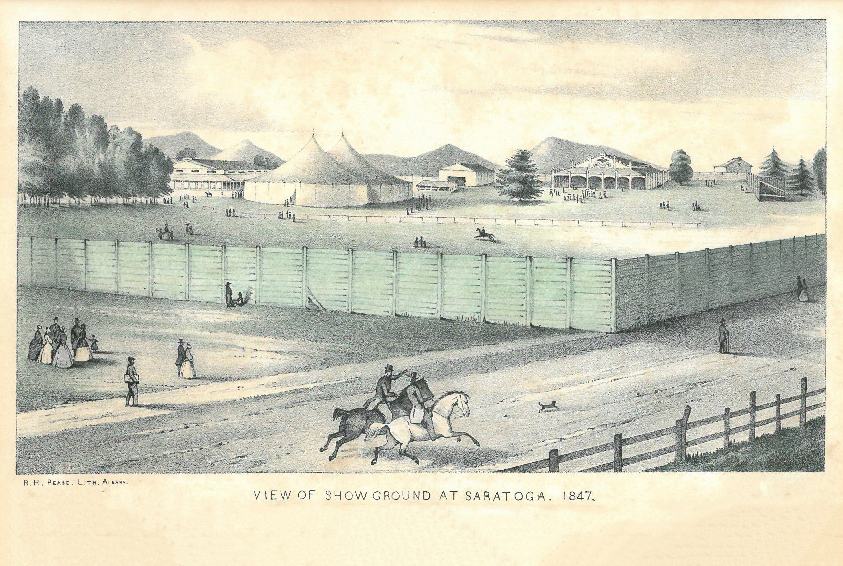 This image shows a drawing of the construction of the 1847 NY State Fair that was held in Saratoga Springs, near the present-day race track. Horse racing was a big draw at the state fair.