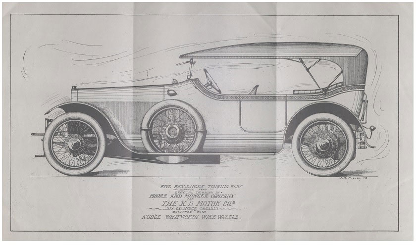 Original advertising image from the Knight-Davidson Motor Company records, Baker Library, Harvard Business School. The March 13, 1913 issue of Motor World magazine reported from the Boston Auto Show; "there is nothing of the severity in the lines of the K-D Car. It departs further from the accepted straight-line effect than any other car in the show, though the lines are pleasing withal and suggest not at all the multitudinous curves that help give the typical foreign car its outre appearance to American eyes. Yet the body has a decidely foreign appearance that is heightened to a degree by its wire wheels and its unusual fender lines. The hood is long, to accomodate its six-cylinder motor, and after the manner that apparently is coming into greater vogue, slopes gradually upward from the front."