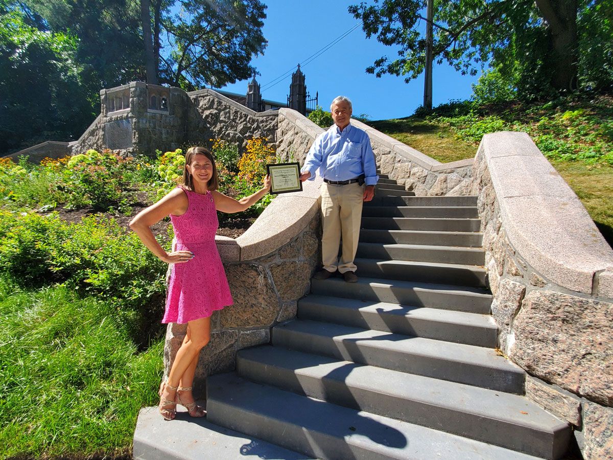 Middle: In 2020, Samantha giving Skip a Preservation Recognition Award for the restoration of the Katrina Trask Memorial Gateway.