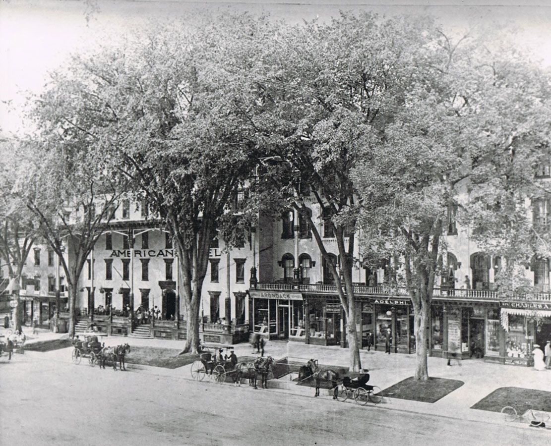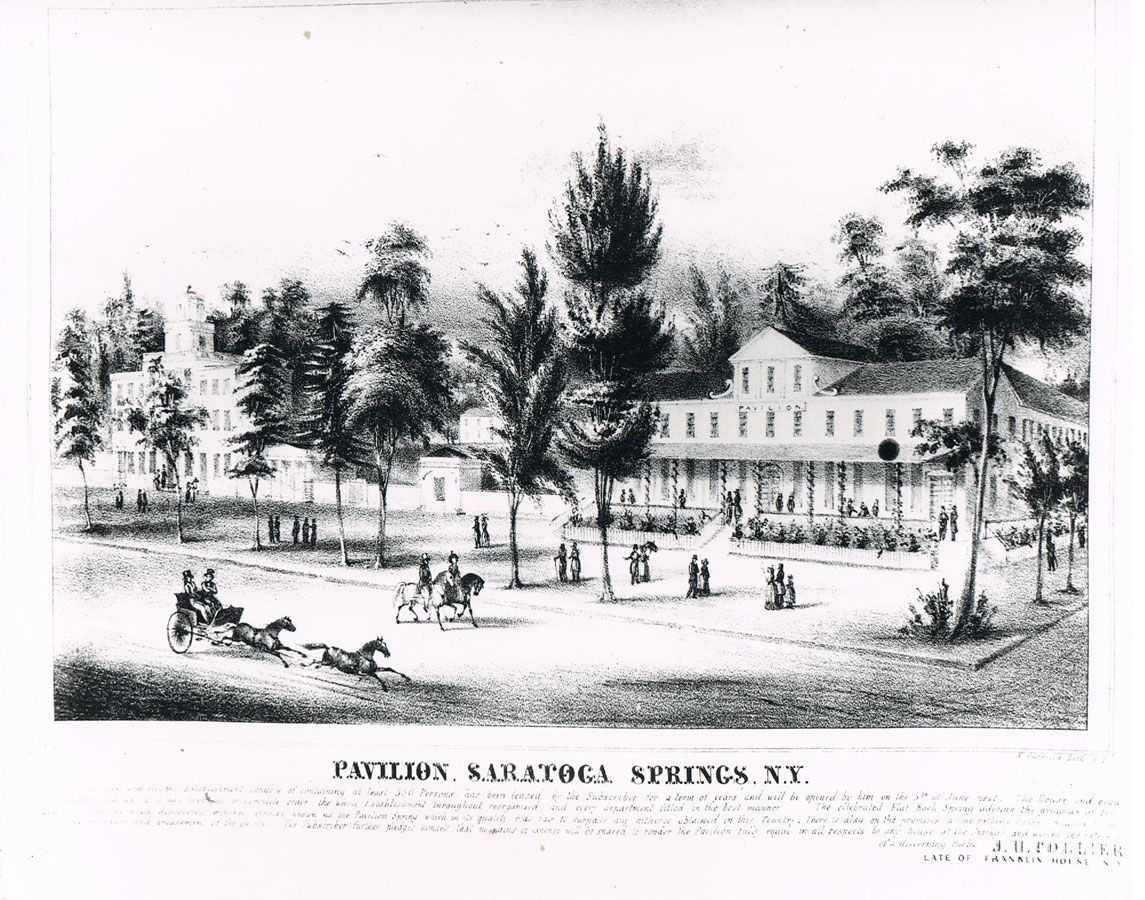 One of the very early hotels in Saratoga Springs, the Pavilion was located on the northeast corner of Broadway and Lake Avenue. The hotel was razed years ago and is the site of the present-day City Hall.