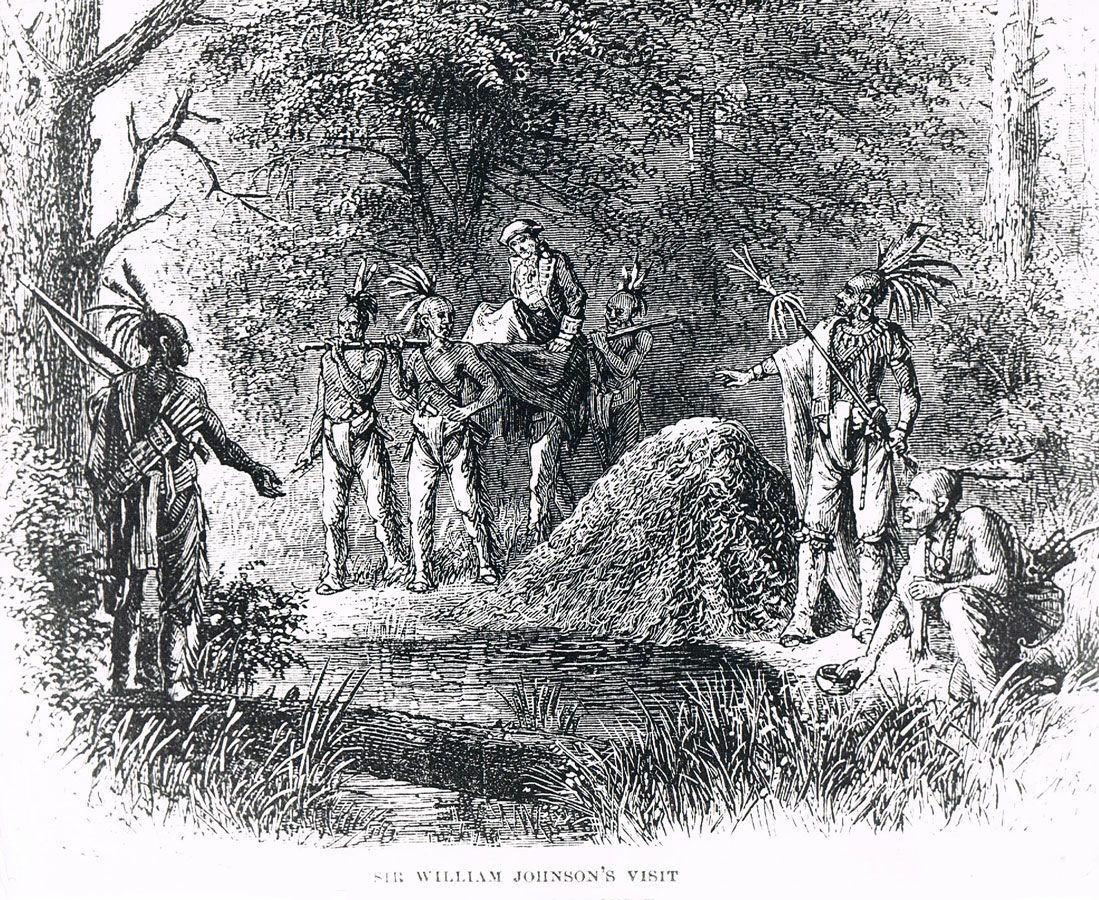 The area of the present-day city of Saratoga Springs was very sacred to the Mohawk mostly because of the healing waters that flowed from the springs. The Mohawk kept the waters of the High Rock secret and protected it from visitation by area settlers. The High Rock spring was referred to by the Mohawk as “The Medicine Spring of the Great Spirit.” The story is that it was not until 1771 that the Mohawk allowed the first European to visit the area to take the waters. In that year an ill Sir William Johnson, who served as Agent for Indian Affairs for the British, was carried by the Mohawk on a litter to visit what many believe was the High Rock Spring. In Sir William’s account of the event, he refers to visiting a spring “northward of Schenectady.” Since the Mohawk respected Johnson as a friend and they knew he had been suffering from a lingering illness that they felt could be remedied with the use of the waters at a spring, they probably brought him to the High Rock. During his stay of four days at the spring, he drank and bathed with the waters and at the end of those days he felt stronger and walked most of the way back to his house in the Mohawk Valley. Soon after his arrival home he wrote to friends to tell the amazing story of the curing powers of the High Rock.