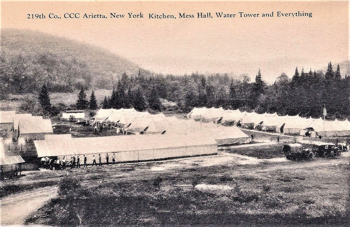 During the summer of 1933 the CCC camp at Shaker Place in the Town of Arietta on Rt. 10 near Piseco Lake housed approx. 200 men in Army tents. There is a flag pole where the men gathered each morning and afternoon for roll call and assignment of duties. The kitchen and long mess hall tent are on the lower left and rows of large tents for enrollees are on the right. Courtesy of Robert L. Markovits Collection