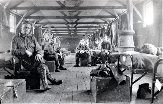 CCC foreman (left) and enrollees relaxing in one of the five barracks in their camp. Forty young men lived there. Three pot-bellied stoves burned coal to keep them warm. The men kept their barracks in an orderly fashion because the Army officers had frequent inspections. Adirondack Experience Library