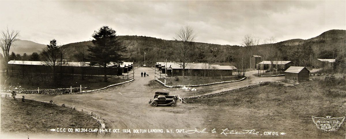 The Bolton Landing CCC camp in the fall of 1934. It had approx. 15 buildings consisting of five barracks, mess hall, recreation hall, administration building, infirmary, shower/toilet, garages, and blacksmith shop. Courtesy of Joe & Betty Demates