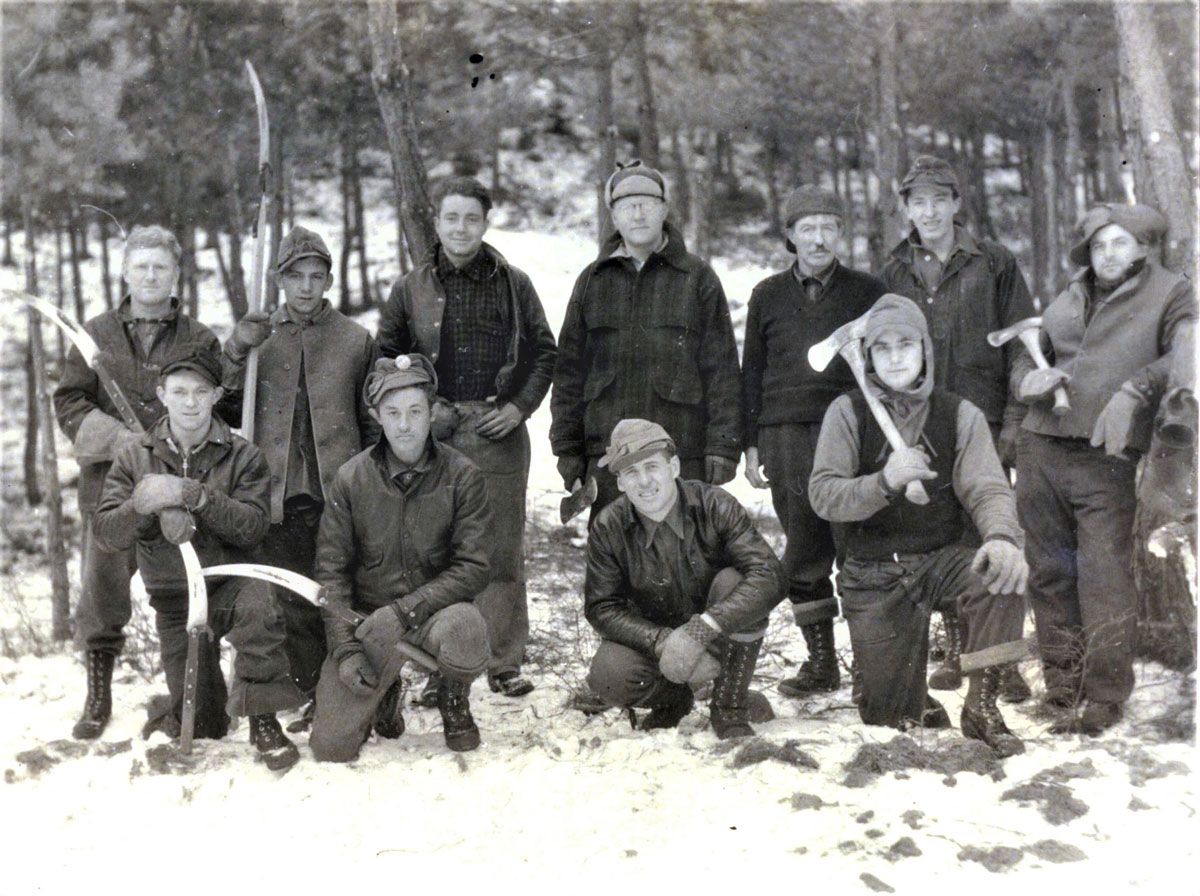 Paul Smiths CCC enrollees and their foreman taking a break from thinning and pruning trees in the state forest near Barnum Pond. Courtesy of Jim Coral