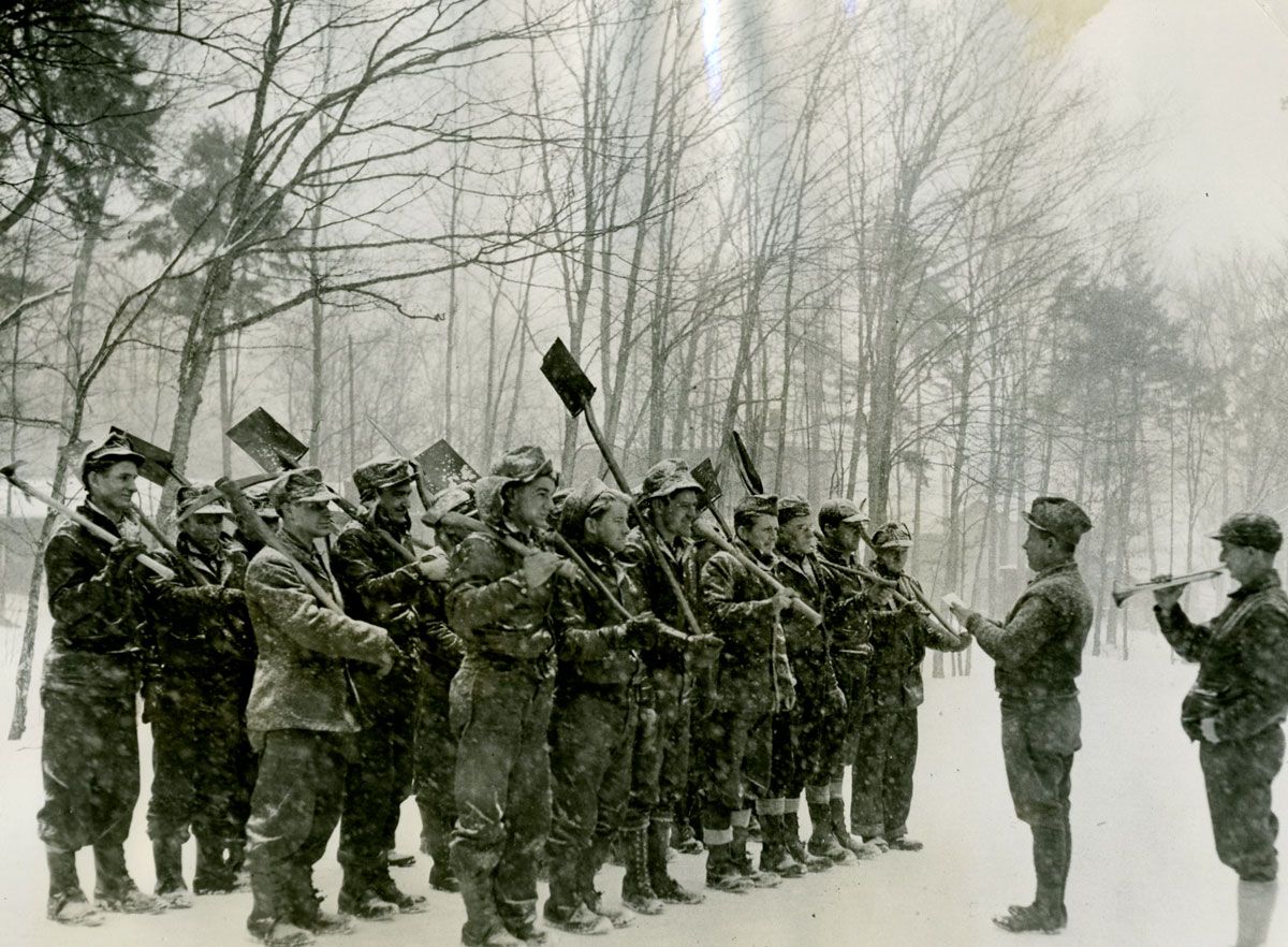 This Associated Press photo dated Dec. 29, 1933, shows Lake Placid CCC enrollees with their shovels and picks at the Whiteface Inn listening for their orders of the day with the bugler poised to give the “rouse” call to their duties in the cold weather. Podskoch Collection