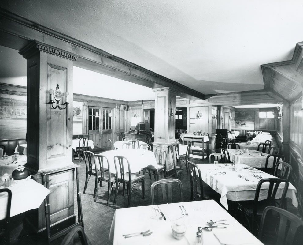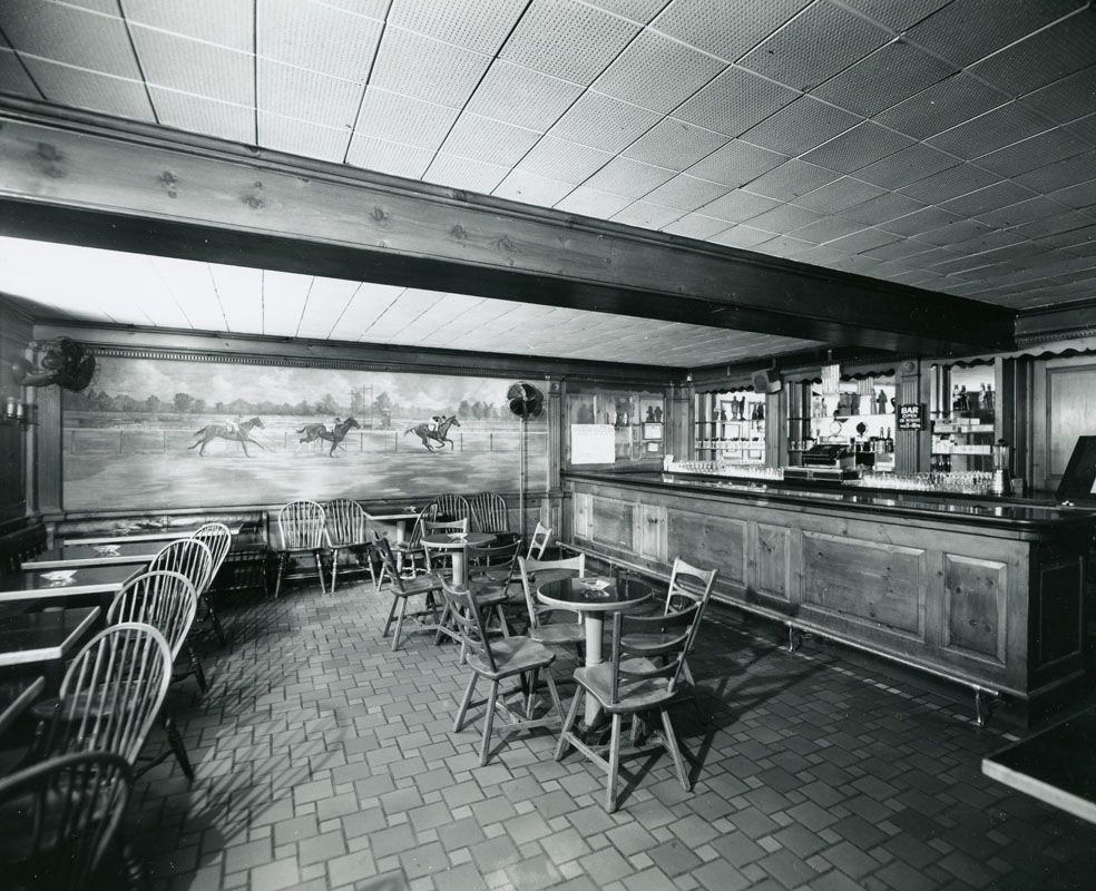 Rathskeller bar at the Worden Hotel in 1945 with the Edward P. Buyck mural on the far wall of Man o’ War disposing of Upset and John P. Grier in the 1920 Travers Stakes. An important element of this painting was that in 1919 Upset was the only horse to ever finish ahead of Man o’ War. Courtesy of the George S. Bolster Collection of the Saratoga Springs History Museum.