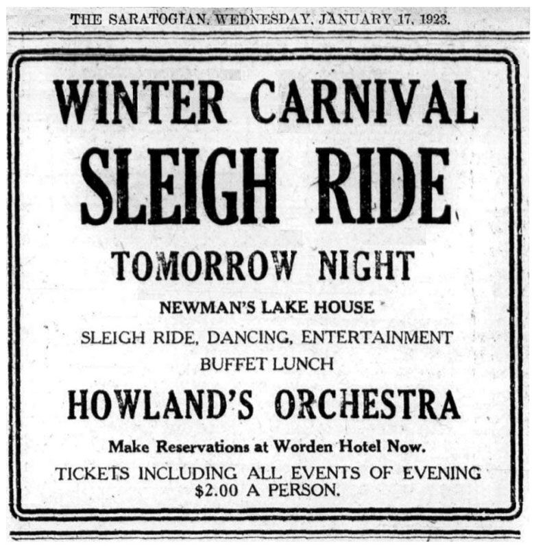 Dashing through the snow on evening community sleigh rides from the Worden Hotel to Saratoga Lake were a feature of the Winter Carnival of 1923 when this image was captured. Courtesy of the George S. Bolster Collection of the Saratoga Springs History Museum.