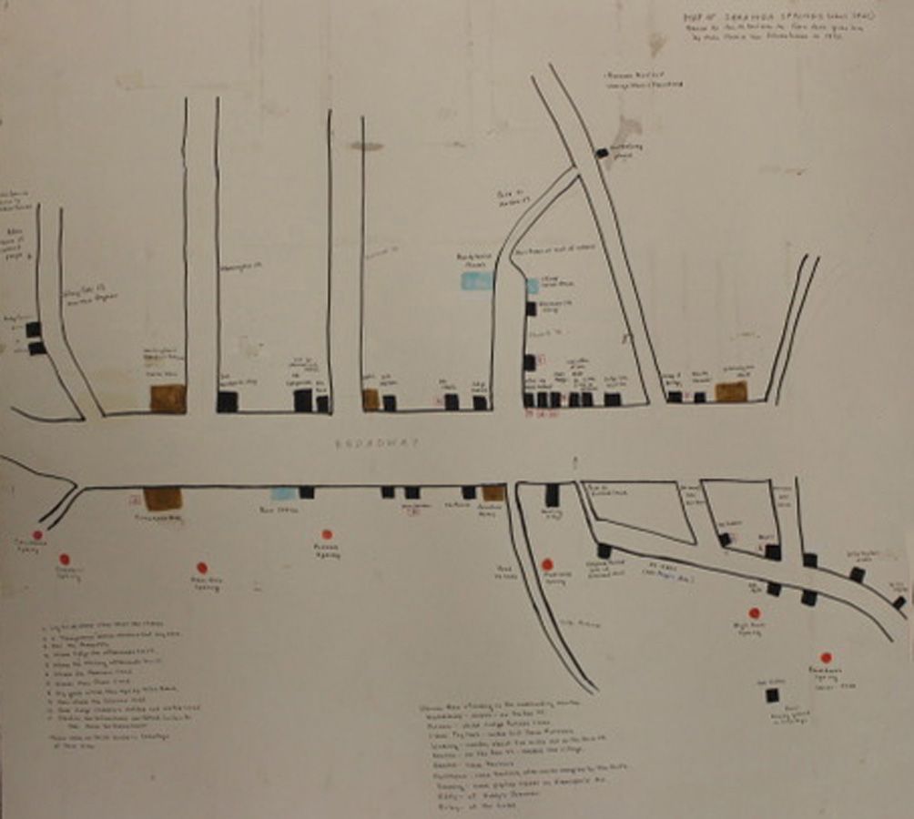 One of the earliest maps of Saratoga Springs is a memory map from the Skidmore Mapping Collection. This 1820 map done from memory shows Gideon Davison‘s house as being one of the few structures on Broadway at that time.
