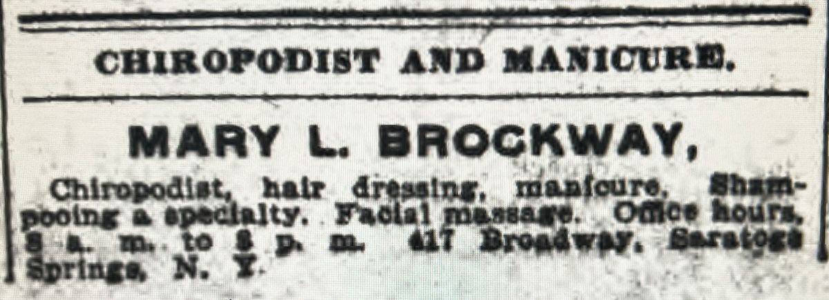 In the 1890s, the building housed a basement millinery shop and a second-story salon run by Mary L. Brockway, a resident chiropodist and beauty specialist. Her business reflected the growing popularity of wellness and grooming in Saratoga's resort era. Brockway offered services catering to locals and visitors, including hairdressing, manicures, facial massage, and scalp treatments. A 1906 ad boasts she was a "Marcel Waving specialist." Another ad invited readers to "meet their favorite author” by borrowing one of her 12,000 books for a 5-cent per week rental fee. I have to think some of these books were once part of the same library that Gideon had operated from his home.