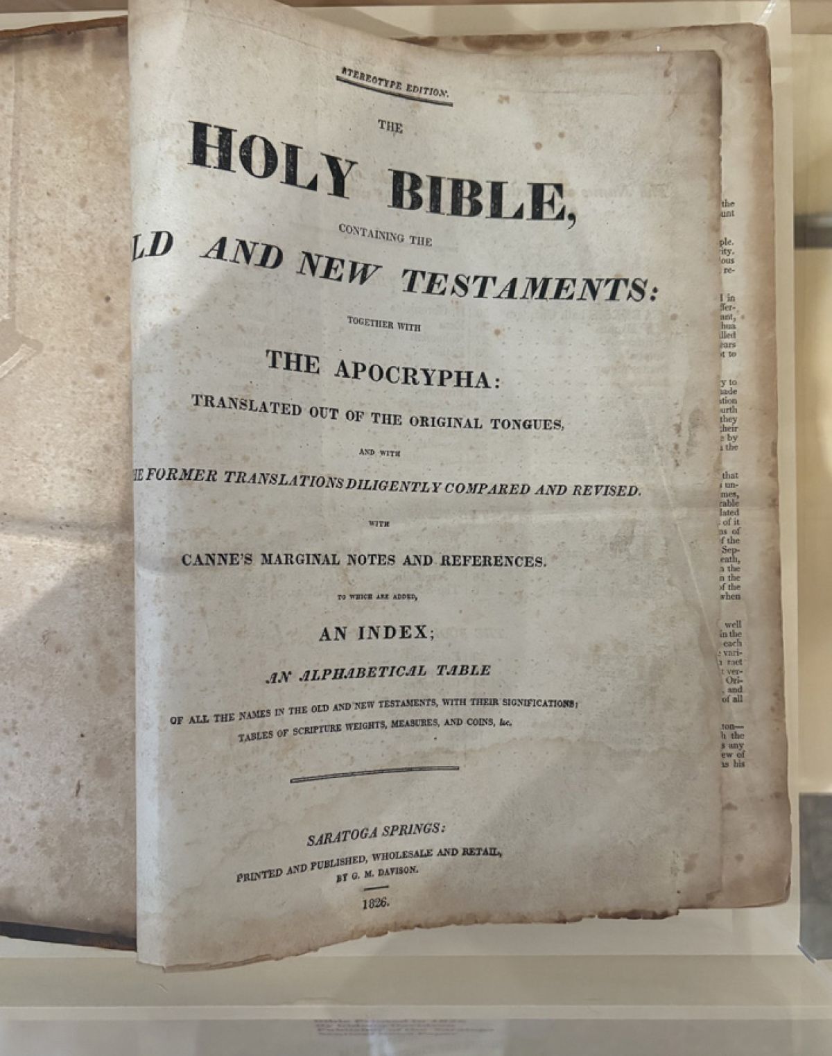 Bible published in 1826 by Gideon Davison at his shop in the back of 417 Broadway. Davison published several types of books including tour guide books, a book analyzing the content of mineral waters, and a spelling book.