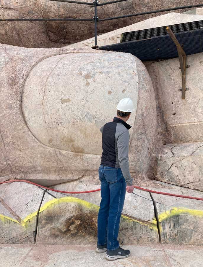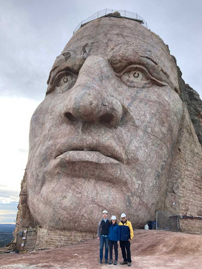 Inevitably, visitors ask when Crazy Horse will be completed, often comparing it to nearby Mt. Rushmore which was carved in 14 years. But Korczak’s grandson, Caleb Ziolkowski, who works on the mountain, points out that the scale of the two sculptures differs dramatically. Mt. Rushmore was carved in high-relief, the presidential busts only partially protruding from stone, whereas Crazy Horse will be a massive 3D sculpture depicting a warrior astride his horse. In fact, all four presidential heads could fit inside Crazy Horse’s 90-foot-tall head. Additionally, Mt. Rushmore’s 10,000 square feet of rock were carved at a rate of 714 square feet per year. Yet if Crazy Horse proceeded at that lowly pace, the sculpture would take 404 years to complete!