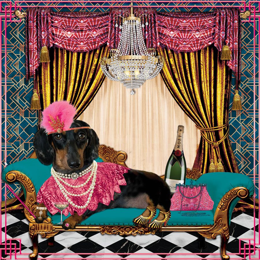 A riot of colors in vivid hues and clashing patterns, What the Kitsch Pet Portraits are brimming with lavish ornamentation offering instantaneous emotional gratification.
