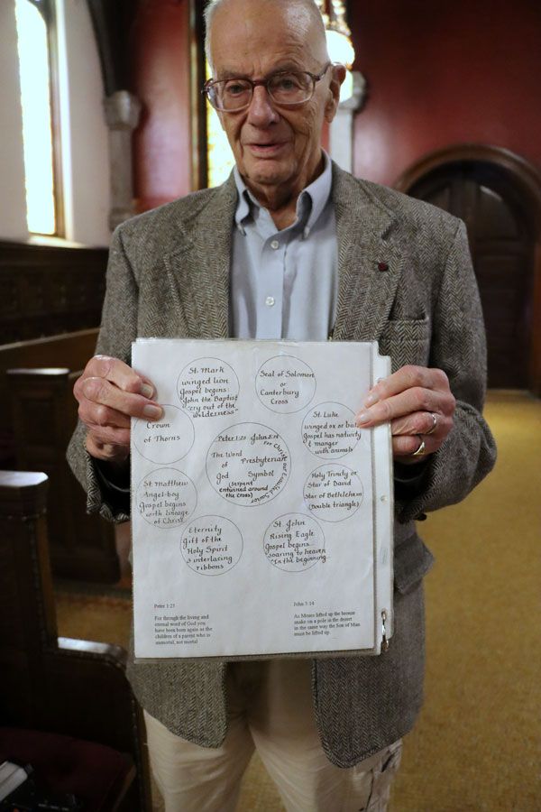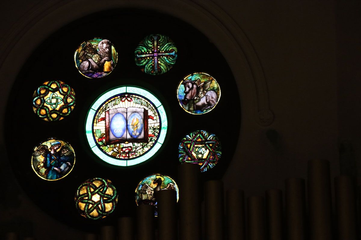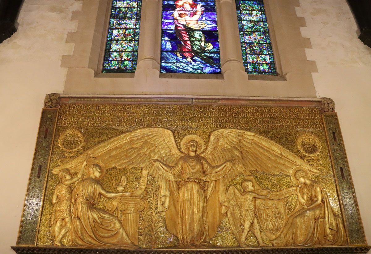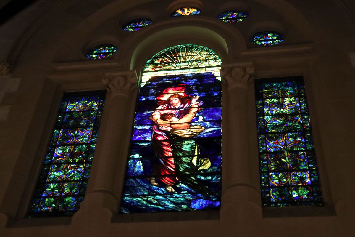 “Now this,” Ed says sweepingly, pointing to the South wall, where a three-panel window sits above a stunning bronze and mosaic tablet, “is inspired from a painting by the English artist Frederick Shields, titled ‘Christ Sustaining Peter on the Water.’” It depicts every emotion surrounding the biblical story. The gilt memorial plaque is quite impressive, with exquisite details that epitomize Faith, Hope, and Charity. One of Tiffany’s most prominent artisans, J. H. Holzer, signed the completed artwork, which generally did not happen in Tiffany’s designs.