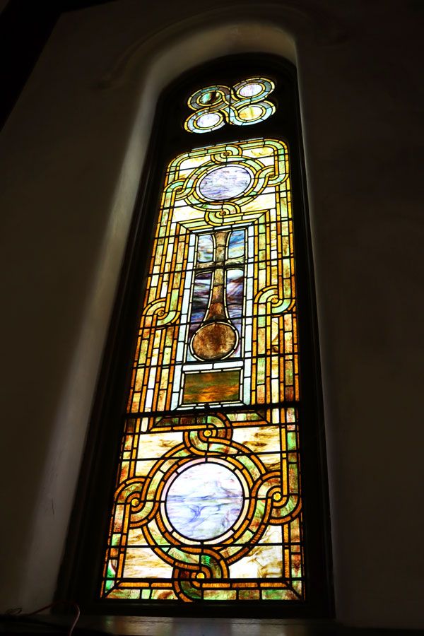 I'm overwhelmed when I think of the nine-paneled rose window showing religious symbols and biblical figures, his 14 opalescent nave windows, the nine leaded glass chandeliers, gold stenciled oak wood furniture and ceiling, mosaic floors, and elaborate gold stenciled and jeweled pulpit. “Tiffany must have been thrilled to see the chapel completed!” I sputter. Imagine my surprise when I learn he never came to see the building in all its glory. “He built these things in his NYC studio, had them brought here and installed by workers. Tiffany had so many projects going on, all in various stages of design and completion - there were many he didn’t see.” Ummm, what???