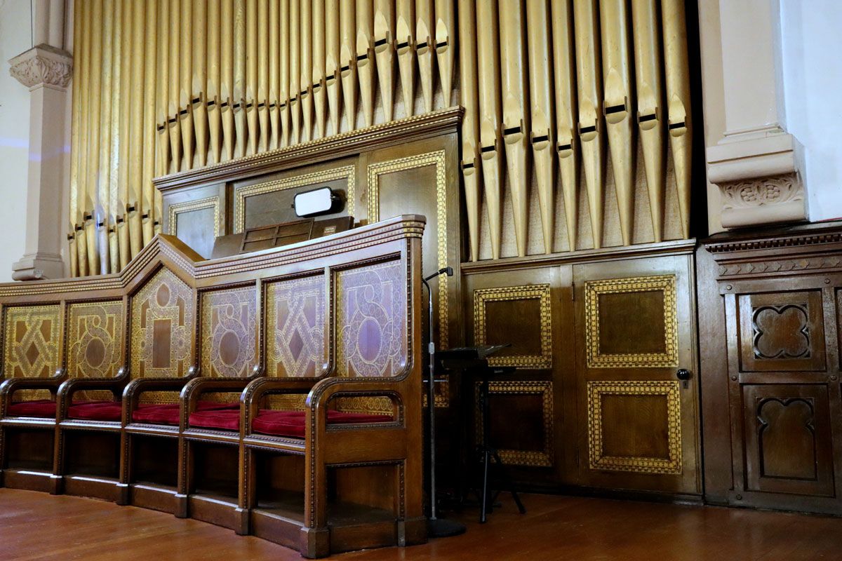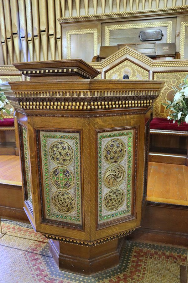 "They’re practicing for a wedding over the weekend. I hope you can hear me; I'll be competing for your attention." Ed smiles in my direction. "The stained glass, the walls, the pews, the mosaic floor tiles - everything but the organ playing at the front of the chapel is Tiffany."